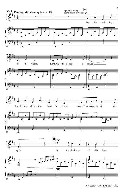 Written during the height of the pandemic, this song of spiritual and physical wellness speaks to many moments of need. Opening with the first few chords of O God, Our Help in Ages Past, the anthem is framed as a petition for God's healing mercy. The fragile melody gently rises and falls, breathing with the sincerity of the lyrics. In the silence help us hear words of hope and promise clear. Teach us not to live in fear. Lord of all, we pray to You. A true anthem of hope!