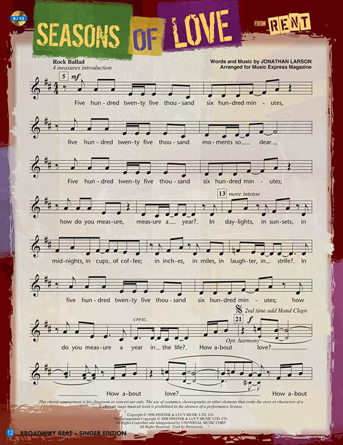 Do you hear that beat? It's the sound of people entering the theater on the most famous street in the world. It's the sound of dancing feet and orchestras tuning up. It's the sound dreams are made of. It's the sound of Broadway! Celebrate musical theatre with hits from Hairspray,The Music Man,The King and I,Wicked,Rent and Grease, and a medley of favorites from George M. Cohan! This unique musical collection for upper elementary and middle school students features seven kid-friendly arrangements for unison voices, piano accompaniments, and fun facts about Broadway by John Jacobson. Extend learning further with a Broadway timeline, board game, and recorded history with music excerpts spanning over a century of song and dance. It's the beat of Broadway and nobody can stop it! Available separately: Teacher Edition, Singer Edition 20-Pak (full color), Performance/Accompaniment CD, Classroom Kit (teacher, Singer 20-Pak, P/A CD). Duration: ca. 25 minutes. Suggested for grades 4-8.