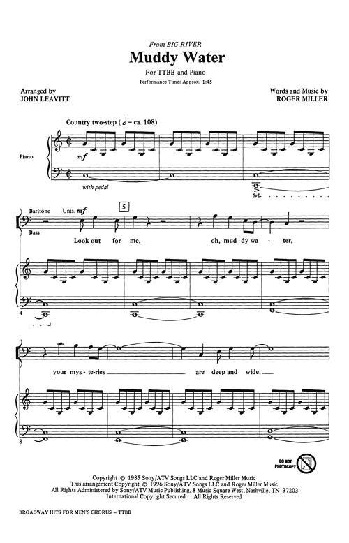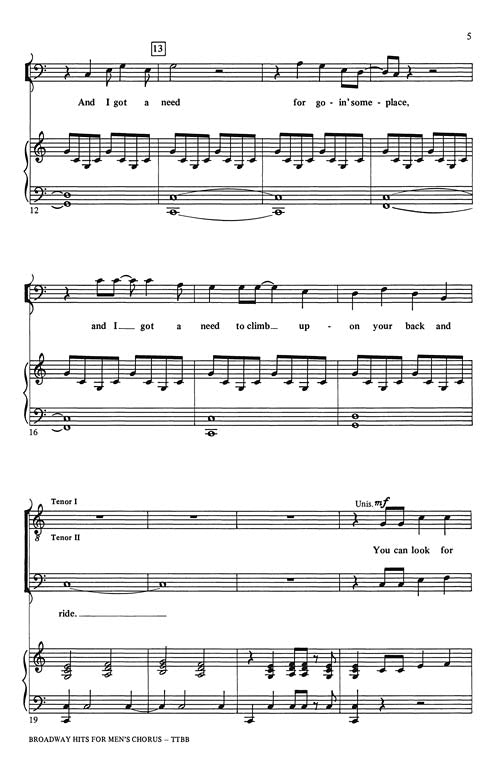Full concert arrangements make this an excellent choice for men's groups. Includes: Muddy Water (Big River), Memory (Cats), Kansas City (Oklahoma!), The Impossible Dream (Man of La Mancha), Bring Him Home (Les Misérables, also available as a single). Available: TTBB.
