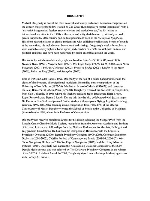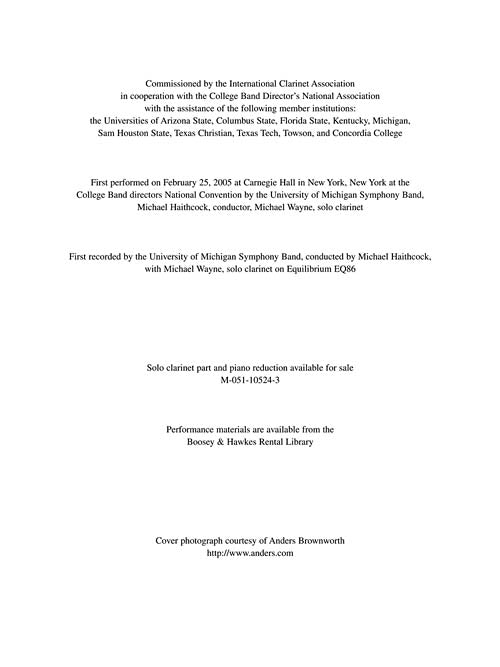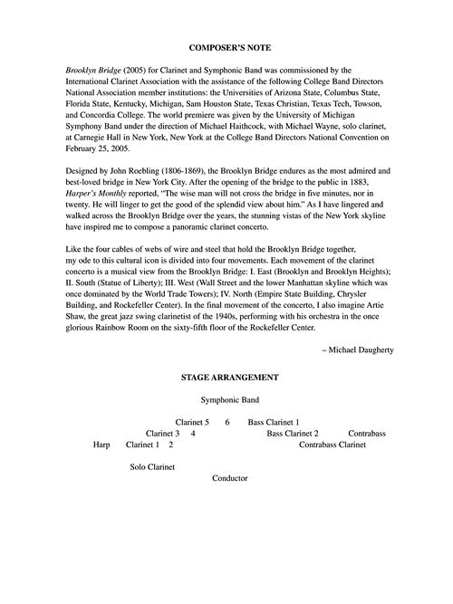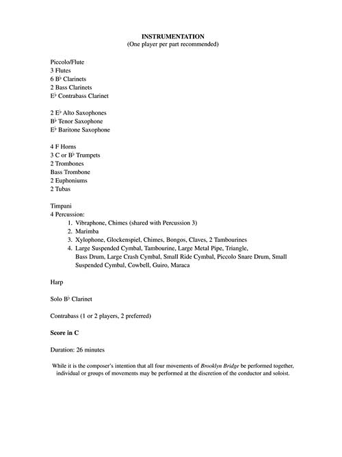 (2005) After the public opening of the Brooklyn Bridge in 1883, Harper's Monthly reported, The wise man will not cross the bridge in five minutes. . . .he will linger to get the good of the splendid view about him. The composer was inspired by the same stunning vistas to write a panoramic clarinet concerto. Like the four cables/webs of wire and steel that hold the Bridge together, the concerto has four movements - East, South, West and North - each like a musical view. It received its premiere performance at Carnegie Hall as part of the College Band Directors National Convention. Duration - ca. 26:00