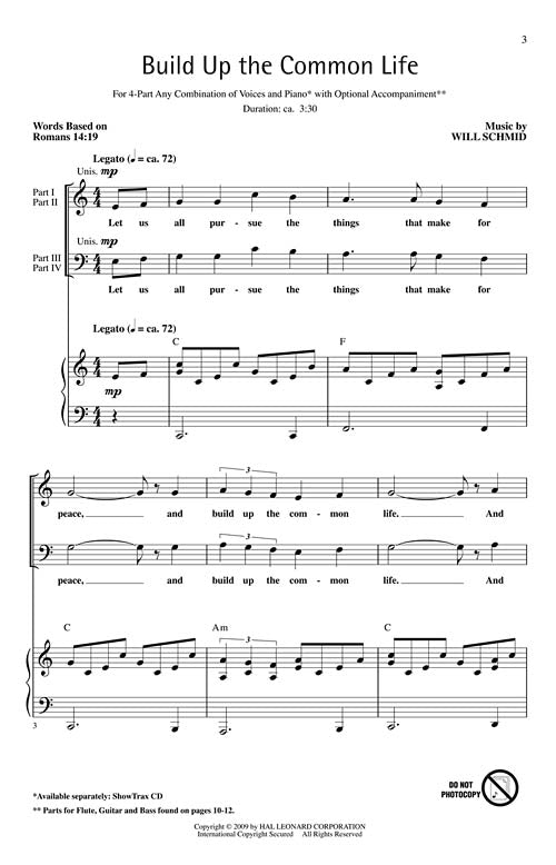 Build your community spirit with this easily learned song that combines World Music Drumming techniques with choral singing and includes a text from Romans 14: Let us all pursue the things that make for peace and build up the common life. Available separately: 4-Part Any Combination, ShowTrax CD. Duration: ca. 3:30.