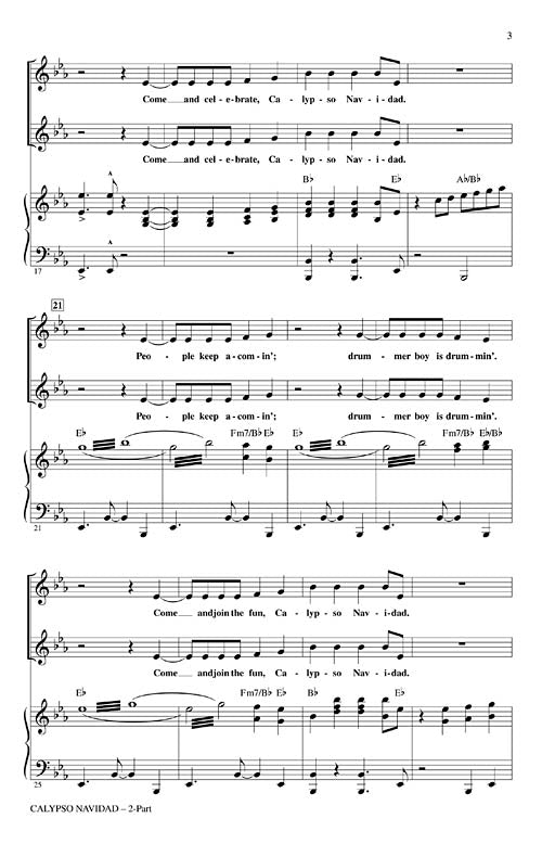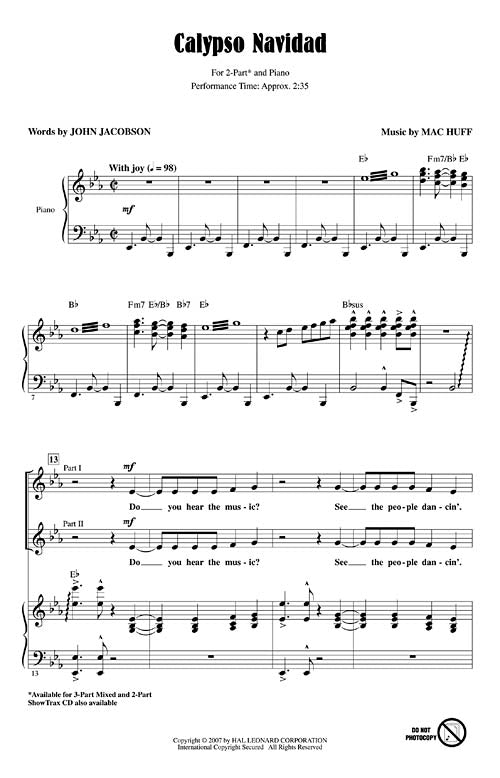 Enjoy your holiday Latin style with this cheerful original that's easily learned and fun to perform. A perfect addition to December concerts! Performance Time: Approx. 2:35.Available separately: 3-Part Mixed, 2-Part and ShowTrax CD.