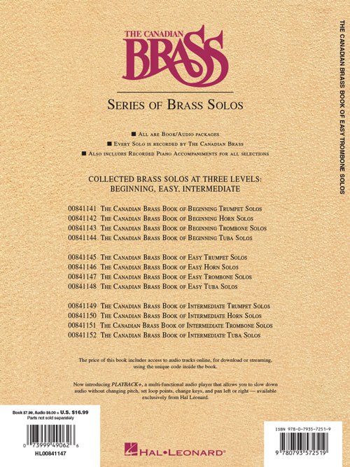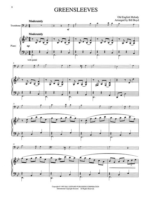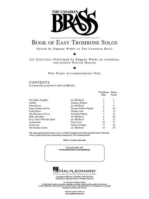 Trombone parts edited and recorded by Canadian Brass virtuoso Eugene Watts, piano parts recorded by Patrick Hansen. Arrangements by Bill Boyd. Companion audio tracks include full performances and accompaniments. Contents: Court Dance · Cruel Love · The Drunken Sailor · Every Time I Feel the Spirit · Greensleeves · Hello! Ma Baby · Largo · Liebestraum · Lullaby · The Pleasures of Love · We Gather Together. The price of this book includes access to audio tracks online, for download or streaming, using the unique code inside the book. The accompanying audio is accessed through Hal Leonard's popular MyLibrary system using the provided code. The audio can be streamed or downloaded and includes PLAYBACK+, a multi-functional audio player that allows you to slow down audio without changing pitch, set loop points, change keys, and pan left or right.