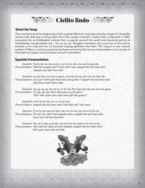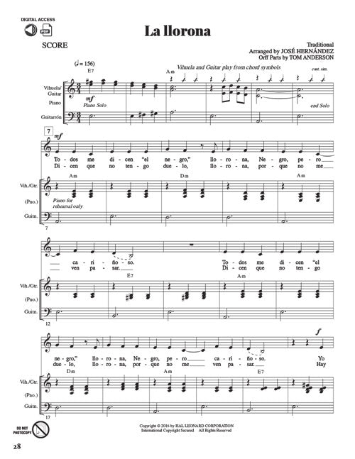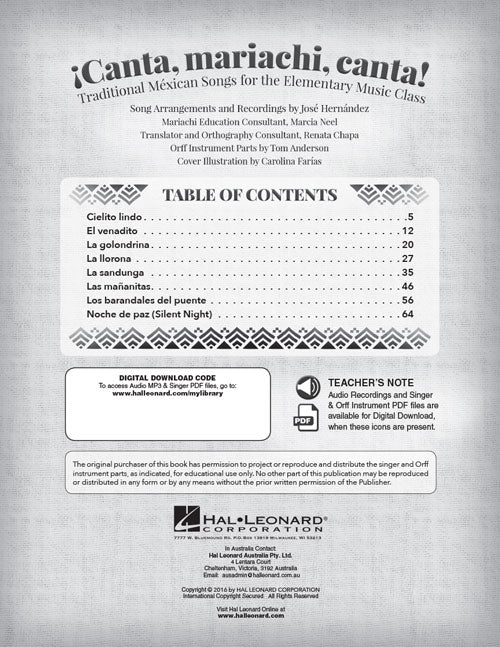 Experience authentic mariachi styles and rhythms in your general music class! Eight traditional Méxican songs transport you and your students to a place rich with harmony and ensemble camaraderie. These arrangements by 3-time Grammy nominated world-renowned mariachi composer and performer Jose Hernandez, work well with piano or guitar accompaniment. Add pitched Orff instruments for even more fun. The Teacher Edition offers vocal parts with Spanish lyrics and pronunciation guides, piano and guitar accompaniment, Orff parts, brief song translations and history. This all-in-one collection also includes digital access to authentic recordings produced by Maestro Hernandez and performed on traditional mariachi instruments for added authenticity! Students can model the singing and then perform with the full-sounding accompaniment recordings. You will also receive digital access to PDFs of singer and instrument parts when you purchase the Teacher Edition. Suggested for grades 3-6.