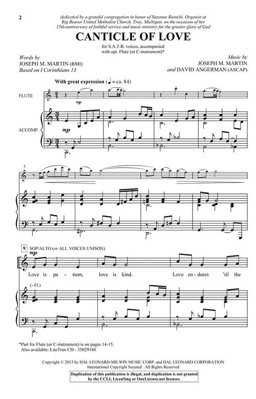 Uses: General, Weddings, Valentine's Day Scripture: I Corinthians 13 Precious Scripture is set to expressive music with this distinctive anthem, ideal for weddings or worship settings. Celebrating the glory of love and describing its many blessings in our lives, the lovely melody duets with a lyric piano part and a delicate flute obbligato. The general usefulness of the text makes this appropriate at any time of the year. Duration: ca. 4:31.