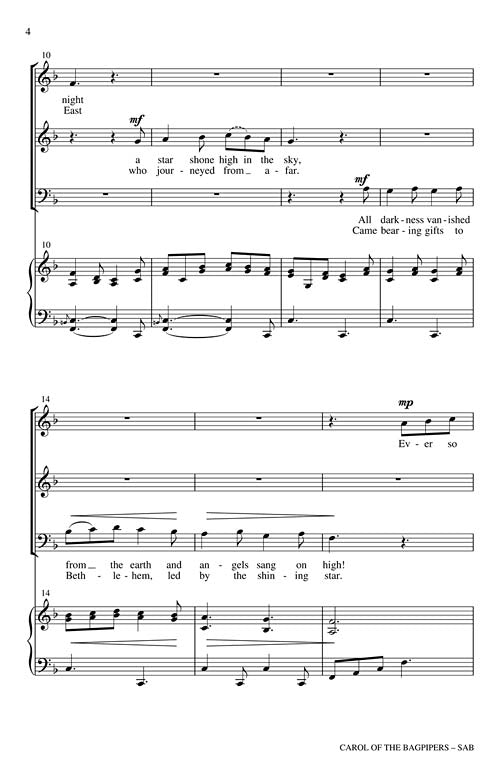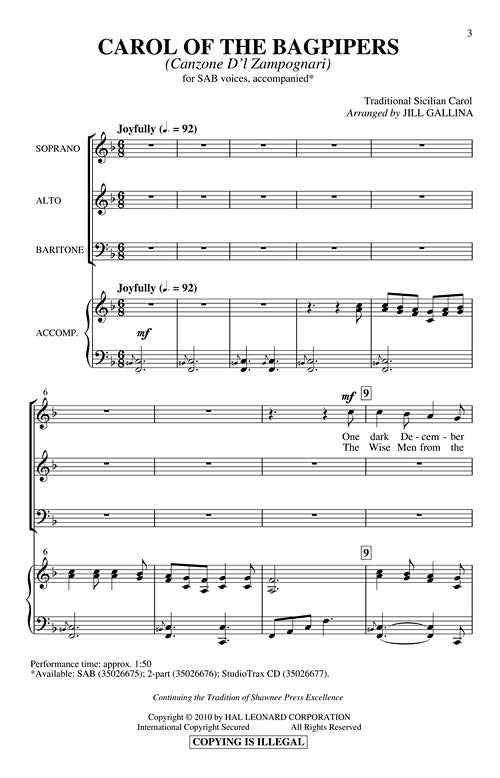 This Sicilian carol is traditionally played on bagpipes by shepherds who serenade Italian villagers the nine days before Christmas. This SAB and 2-part captures the style of the carol and tells the Christmas story with simple unison and harmony throughout. Available separately: SAB, 2-part, StudioTrax CD. Duration: ca. 1:50.