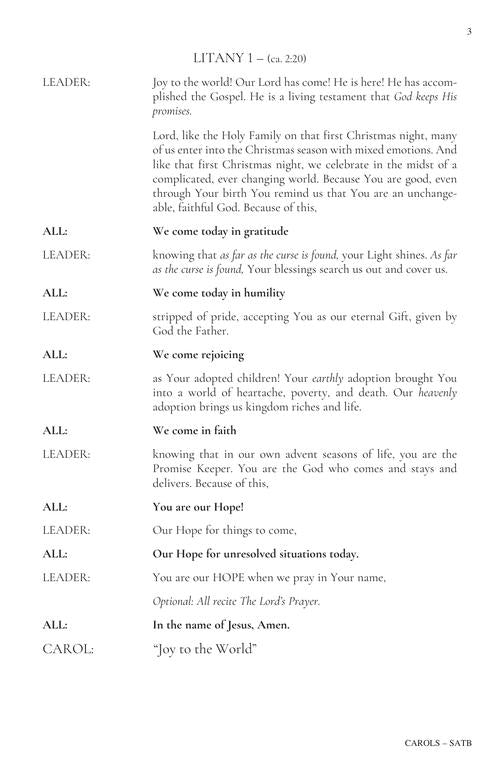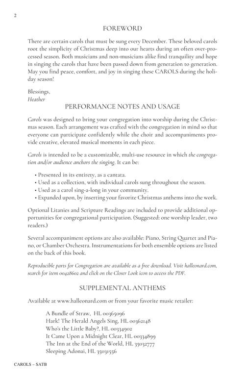 A truly unique offering for the holidays, this one-of-a-kind resource puts congregational participation to front and center in the service of song. Ideal for a Lessons and Carols service or community carol sing, this compilation will be an essential part of your choral library. From tender manger cradle songs to glorious shouts of praise and adoration, this singular resource will give thoughtful worship planners the tools they need for an inclusive worship experience. Songs include: Joy to the World; Away in a Manger; O Come, All Ye Faithful; God Rest Ye Merry, Gentlemen; O Little Town of Bethlehem; The First Noel; Silent Night. Score and Parts for Orchestra (fl, ob, cl, hn, tpt, tbn, mallet perc, timp, perc, vn 1-2, va, vc) and String Quartet (vn 1-2, va, vc) available as a digital download. For the Accompaniment, Split, and Part Dominant Tracks: Audio is accessed online using the unique code generated upon purchase and can be streamed or downloaded. The audio files include PLAYBACK+, a multi-functional audio player that allows you to slow down audio without changing pitch, set loop points, change keys, and pan left or right. HL00428605: Accompaniment Tracks HL00428606: Split Tracks HL00428610: Part Dominant Tracks