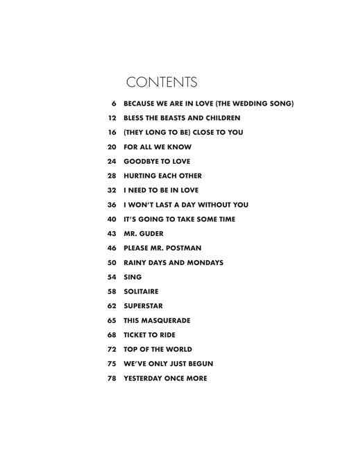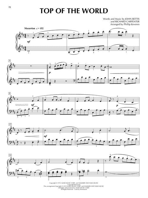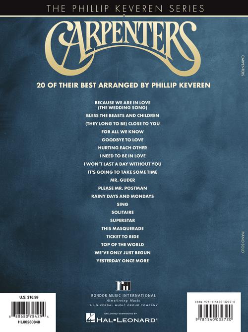 An exquisite collection of 20 of the most recognizable tunes from this popular '70s sibling-duo in a variety of thoughtful and unique arrangements by Phillip Keveren. Includes: (They Long to Be) Close to You · For All We Know · Please Mr. Postman · Rainy Days and Mondays · Solitaire · Ticket to Ride · Top of the World · We've Only Just Begun · and more!