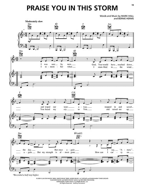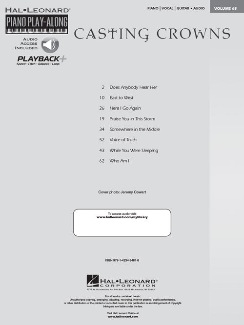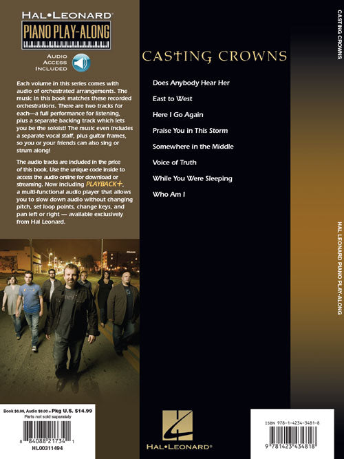 Your favorite sheet music will come to life with the innovative Piano Play-Along series! With these book/audio collections, piano and keyboard players will be able to practice and perform with professional-sounding accompaniments. Containing cream-of-the-crop songs, the books feature new engravings, with a separate vocal staff, plus guitar frames, so players and their friends can sing or strum along. The online audio features two tracks for each tune: a full performance for listening, and a separate backing track that lets players take the lead on keyboard. The high-quality, sound-alike accompaniments exactly match the printed music. The audio is accessed online by using the unique code in each book and includes PLAYBACK+ features such as tempo adjustment and looping capabilities. Eight faves from this popular CCM band: Does Anybody Hear Her · East to West · Here I Go Again · Praise You in This Storm · Somewhere in the Middle · Voice of Truth · While You Were Sleeping · Who Am I.