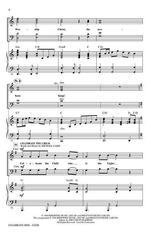 This medley could serve as a brilliant opener for a Christmas service or musical presentation. Includes Angels from the Realms of Glory; Angels We Have Heard on High; Celebrate the Child; Hark! the Herald Angels Sing. Available separately: SATB, Orchestration (fl, ob, cl, bn [=bcl], tpt 1, 2, 3, hn 1, 2, 3 [=asx], tbn 1, 2 [=tsx/bar], tbn 3/tba, timp, perc 1, 2, hp, rhythm, vn 1, vn 2, va [=cl 3], vc, b), CD Accompaniment Trax. Duration: ca. 3:00.