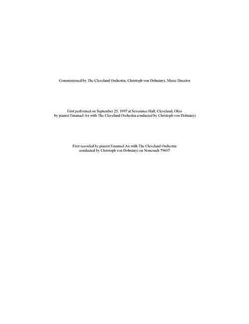 This three-movement work was premiered in 1996 by the Cleveland Orchestra, with Emmanuel Ax as soloist. 28-30 minutes. In the composer's words: The concerto takes a kind of polymorphous-perverse pleasure in the whole past century of piano music, both popular and classical. The original inspiration was in the old piano roll music of the 1920s.