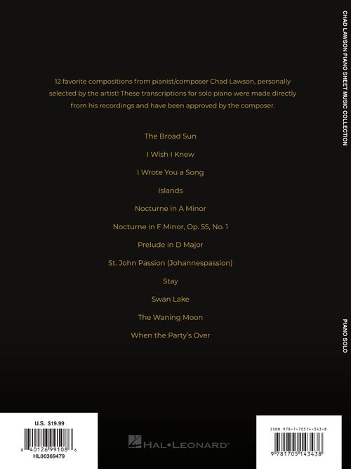 This collection features 12 piano solo arrangements from world-renowned pianist and composer Chad Lawson who has single-handedly redefined what classical piano can sound like. The compositions included were personally selected by the composer who also approved the transcriptions! Titles include: The Broad Sun · I Wish I Knew · I Wrote You a Song · Islands · Nocturne in a Minor · Nocturne in F Minor, Op. 55, No. 1 · Prelude in D Major · St. John Passion (Johannespassion) Christus Der Uns Selig Macht, BWV 245 · Stay · Swan Lake · The Waning Moon · When the Party's Over.