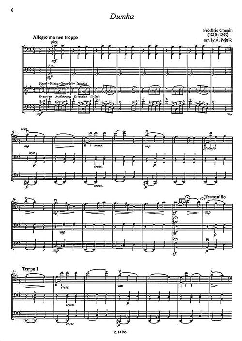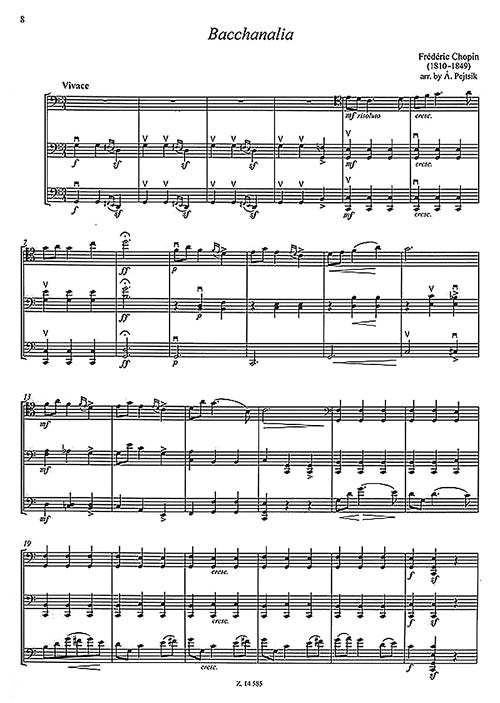 Intermediate level arrangements for cello trio. Includes score and parts. Contents: Tema con variazioni (Brèval) · Dumka, Bacchanalia (Chopin) · Sonata a tre (Vivaldi) · Marche de Mariage, Freymaurer-Hymnus (Mozart)