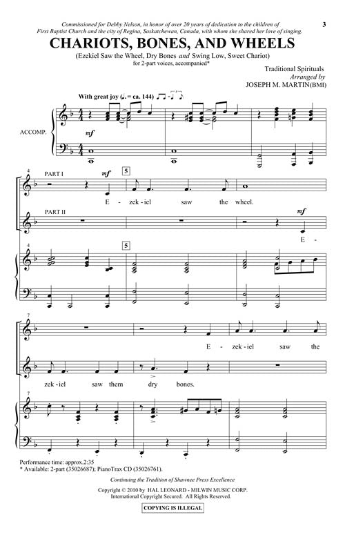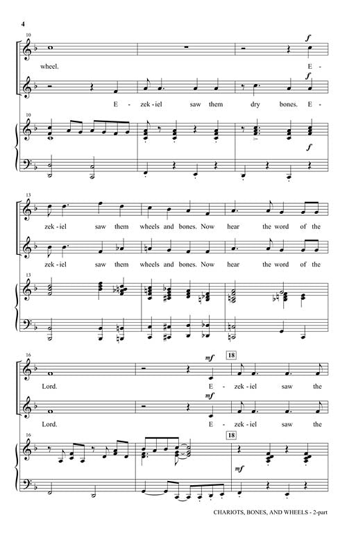 This medley of traditional spirituals is not to be missed! Expertly arranged, this 2-part choral weaves and partners Ezek'el Saw the Wheel, Dry Bones and Swing Low, Sweet Chariot with a lively piano accompaniment. Available separately: 2-part, PianoTrax CD. Duration: ca. 2:35.