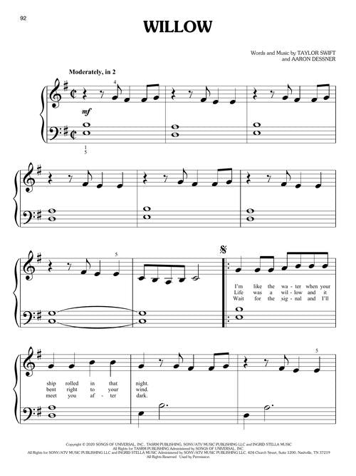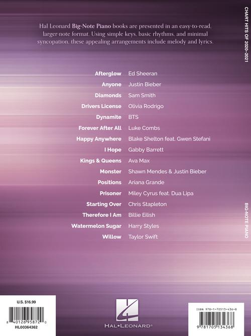 Hal Leonard big-note piano books are presented in an easy-to-read, larger-note format. Using simple keys, basic rhythms, and minimal syncopation, these appealing arrangements include melody and lyrics. This edition features 16 of the top hits of 2020 into 2021, including: Drivers License (Olivia Rodrigo) · Dynamite (BTS) · I Hope (Gabby Barrett) · Kings & Queens (Ava Max) · Monster (Shawn Mendes & Justin Bieber) · Positions (Ariana Grande) · Therefore I Am (Billie Eilish) · Watermelon Sugar (Harry Styles) · Willow (Taylor Swift) · and more.