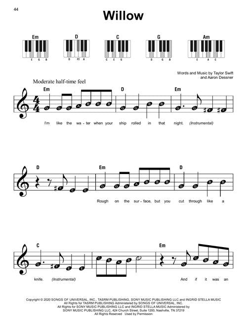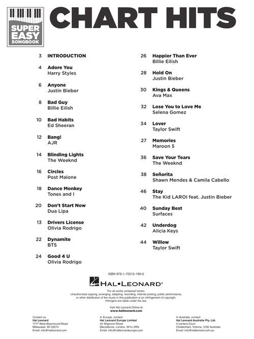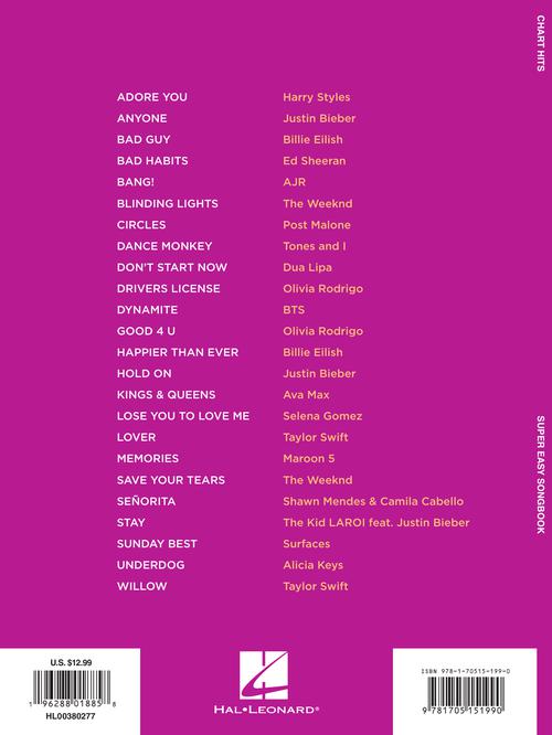It's super easy! This series features accessible arrangements for piano, with simple right-hand melody, letter names inside each note, basic left-hand chord diagrams, and no page turns. The arrangements also include lyrics. This edition includes 24 contemporary hits: Bad Habits (Ed Sheeran) · Blinding Lights (The Weeknd) · Circles (Post Malone) · Good 4 U (Olivia Rodrigo) · Kings & Queens (Ava Max) · Memories (Maroon 5) · Stay (The Kid LAROI feat. Justin Bieber) · Willow (Taylor Swift) · and more.