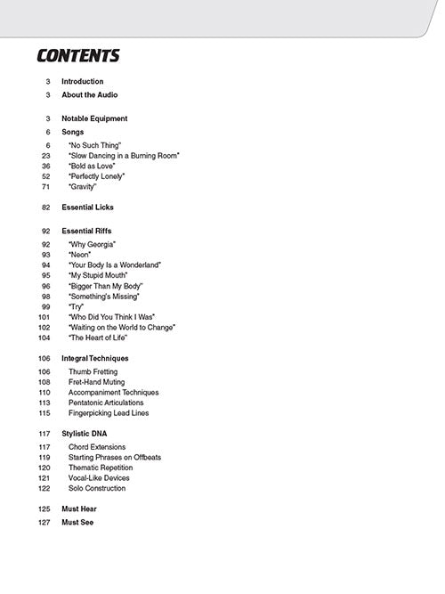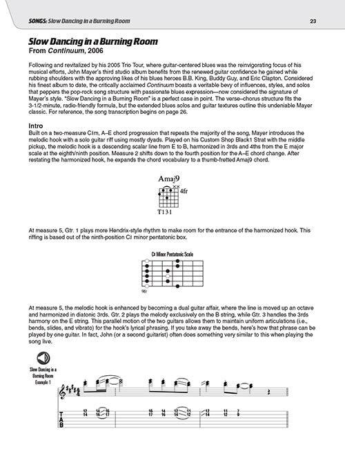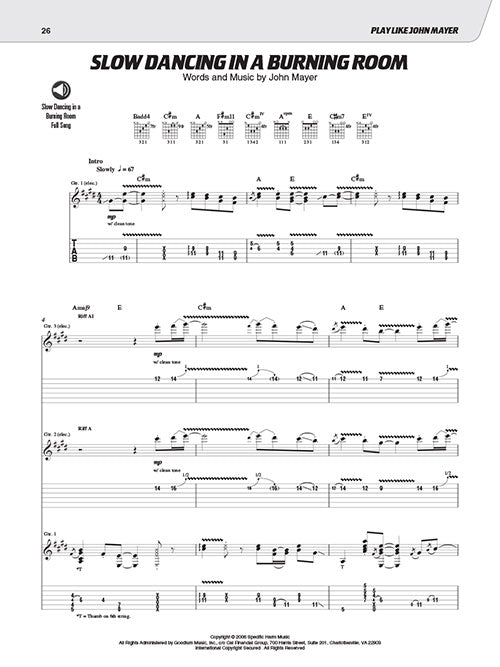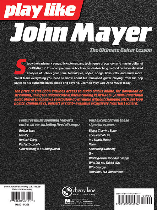 Study the trademark songs, licks, tones, and techniques of pop icon and master guitarist John Mayer. This comprehensive book and audio teaching method provides detailed analysis of John's gear, tone, techniques, styles, songs, licks, riffs, and much more. You'll learn everything you need to know about his renowned guitar playing, from his pop styles to his authentic blues chops and beyond. The price of this book includes access to audio tracks online, for download or streaming, using the unique code inside the book! Including PLAYBACK+, a multi-functional audio player that allows you to slow down audio without changing pitch, set loop points, change keys, pan left or right. This book features lessons from 15 songs spanning Mayer's entire career as well as five full songs: Bold as Love · Gravity · No Such Thing · Perfectly Lonely · Slow Dancing in a Burning Room - and excerpts from many others.