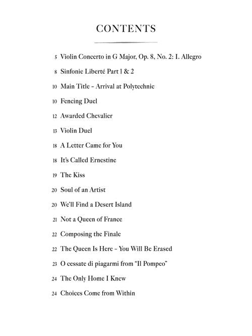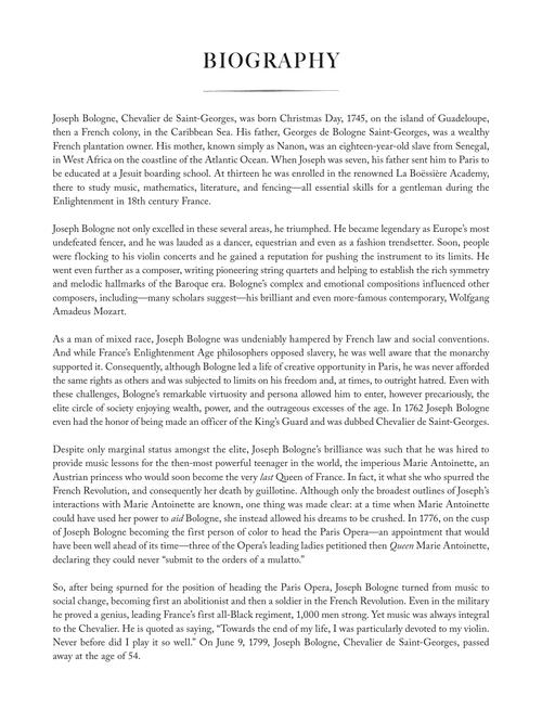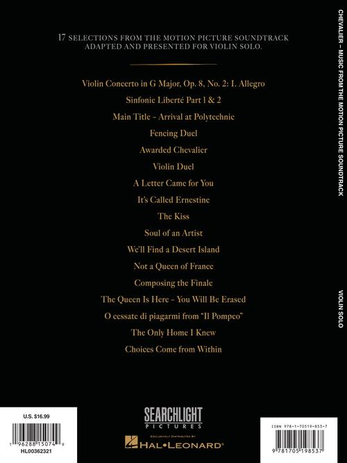 Joseph Bologne, Chevalier de Saint-Georges, was born Christmas Day, 1745, on the island of Guadeloupe, then a French colony, in the Caribbean Sea. The son of a wealthy plantation owner and a slave, he rose to unimaginable heights in French society thanks to his excellence in many things including math, literature, and fencing, but most of all, music. He became one of the most popular violinists and composers in France, even hired to provide music lessons for the imperious Marie Antoinette who would become the last queen of France. Bologne's amazing life story came to life in the 222 film Chevalier. Our matching folio includes original works by Bologne as well as violin solo arrangements of the score by Kris Bowers and featuring Violin Duel by Michael Abels. The book also includes a short biography of Bologne.
