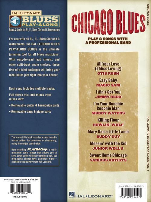 For use with all C, Bb, Eb, and Bass Clef instruments, the Hal Leonard Blues Play-Along Series is the ultimate jamming tool for all blues musicians. With easy-to-read lead sheets and other split-track choices on the included audio tracks, these first-of-a-kind packages will bring your local blues jam right into your house! Each song includes two tracks: a full-stereo mix, and a split-track mix with removable guitar, bass, piano and harmonica parts. 8 songs: All Your Love (I Miss Loving) · Easy Baby · I Ain't Got You · I'm Your Hoochie Coochie Man · Killing Floor · Mary Had a Little Lamb · Messin' with the Kid · Sweet Home Chicago. Audio is accessed online using the unique code inside the book and can be streamed or downloaded. The audio files include PLAYBACK+, a multi-functional audio player that allows you to slow down audio without changing pitch, set loop points, change keys, and pan left or right.
