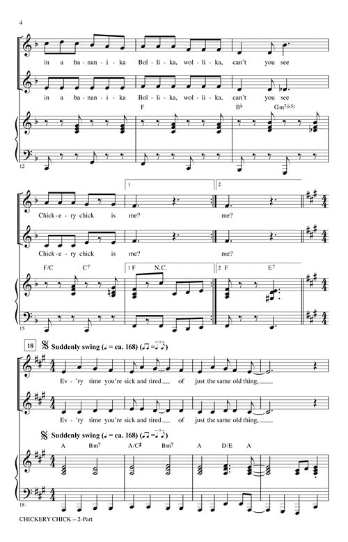 Your singers will have fun with this novelty song from the 1940's and develop their vocal jazz chops at the same time! Opening in a happy-go-lucky 6/8, it sounds like an Italian street song full of nonsense lyrics, then it transitions into 4/4 swing with an easy scat section. Available separately: 3-Part Mixed, 2-Part, VoiceTrax CD. Duration: ca. 2:40.