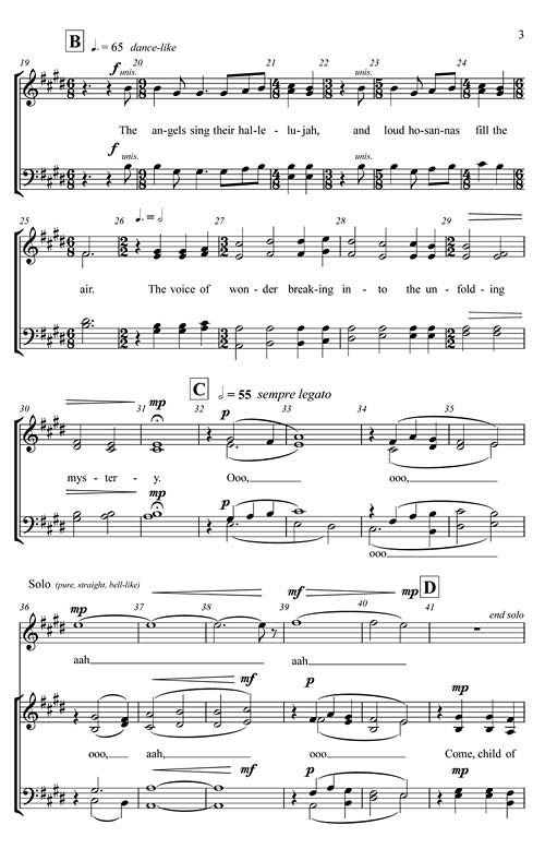 Mr. Lee has created a modern-day madrigal as a lovely anthem for Advent. Set for a cappella voices, the changing meters and tempos might seem a challenge. But these characteristics are logical and roll off with simplicity and grace, adding musical interest and attention to the text. For church choirs. Easy-medium.