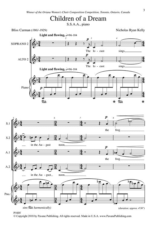 Nicholas Ryan Kelly, an emerging composer, was introduced to Pavane Publishing through his winning composition in the North Dakota State Edwin Fissinger competition. This new piece demonstrates his skills of musically describing the text. The piano writing is not an accompaniment, it is part of the piece. The vocal writing, the modulations, all reveal an artist at work. Poet Bliss Carman provides a text describing nature's rich colors, which are skillfully enhanced under Kelly's care.