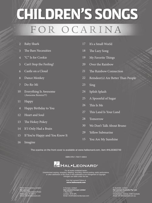 This super fun collection fatures 30 popular hits arranged for 10-, 11-, or 12-hole ocarinas, including: Baby Shark · Castle on a Cloud · Dance Monkey · Happy · Happy Birthday to You · The Hokey Pokey · Imagine · It's a Small World · Over the Rainbow · This Land Is Your Land · Tomorrow · We Don't Talk About Bruno · Yellow Submarine · You Are My Sunshine · and more.