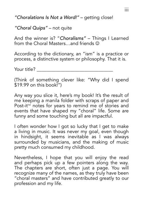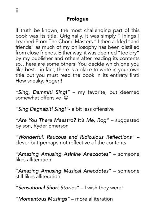 This is the perfect gift for all the choral people in your life, for the holidays, Christmas time or anytime. Renowned composer/arranger Roger Emerson has been keeping notes of wise words from the many choral mentors in his life - conductors, composers, producers, publishers. His way of passing on these stories is as clever, delightful and often humorous as his musical writing. (Did I just call his music writing humorous?). Plus, the lessons are spot on and priceless. Find out what choralisms really means and get a copy of this book for yourself - now!