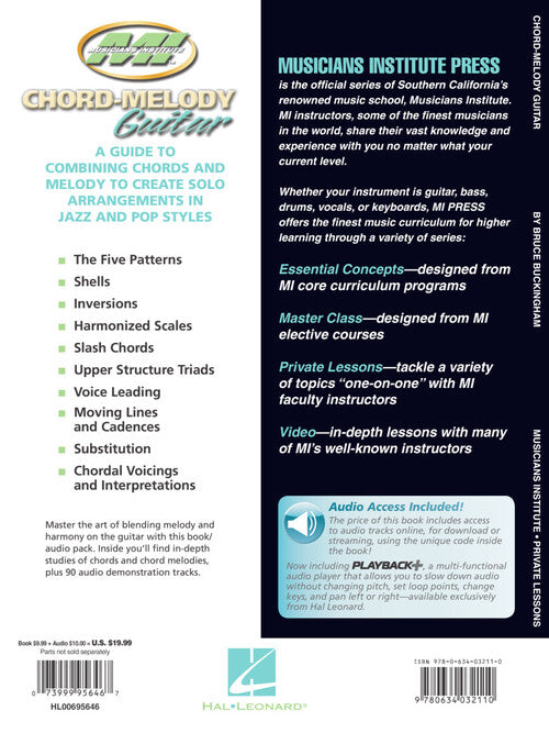 Master the art of blending melody and harmony on the guitar! This book with online audio includes in-depth studies of chords and chord melodies and 90 recorded demonstration tracks. Lessons include: the five patterns; chord shells; inversions; voice leading; cadences; diminished chords; and more. Audio is accessed online using the unique code inside the book and can be streamed or downloaded. The audio files include PLAYBACK+, a multi-functional audio player that allows you to slow down audio without changing pitch, set loop points, change keys, and pan left or right.