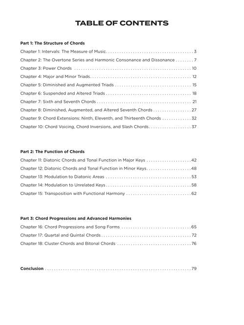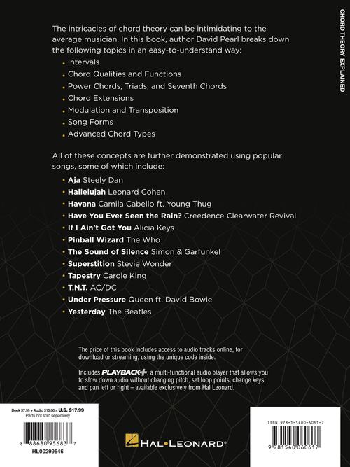 The intricacies of chord theory can be intimidating to the average musician. In this book, author David Pearl breaks down the following topics in an easy-to-understand way: intervals · chord qualities and functions · power chords, triads and seventh chords · chord extensions · modulation and transposition · song forms · and advanced chord types. All of these concepts are further demonstrated using popular songs, some of which include Hallelujah by Leonard Cohen, Pinball Wizard by the Who, Superstition by Stevie Wonder, Yesterday by the Beatles and many more.