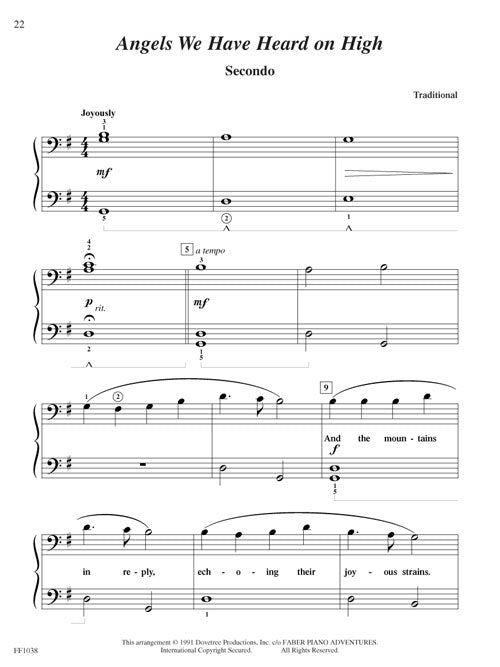 This entertaining collection of 8 Christmas duets uses the keys of C major, G major, and D minor. Arranged to frequently move the melody from one player to another. Students often play in a 5-finger position. Includes: Jingle Bells · Fum, Fum, Fum · We Three Kings of Orient Are · French Carol (Il est né) · O Christmas Tree.