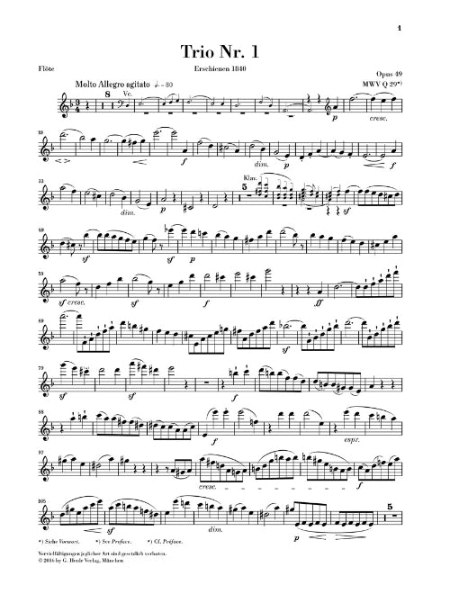 After an early work and a discontinued attempt in 1831/32 Mendelssohn made his breakthrough in this important chamber music genre in the summer of 1839 with the Piano Trio in D minor Op. 49, which was to be followed six years later by the Trio in C minor Op. 66. On publication of the first trio, Schumann took the opportunity to describe the composer as the Mozart of the 19th century, whereby he was obviously alluding to the mixture of Classical and Romantic stylistic elements. Mendelssohn made this flute part as an alternative version of Op. 49 (flute instead of violin).