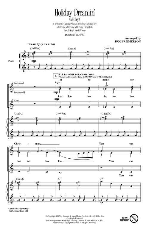 You'll create a magical Christmas dreamscape with this delightful 6-minute medley for SSA. Opening with the reflective I'll Be Home for Christmas, it moves into a bouncy boogie-woogie Rockin' Around the Christmas Tree, into a swing treatment of Let It Snow! Let It Snow! Let It Snow! and the sweet waltz feel of Silver Bells. A gem! Available separately: SSA, ShowTrax CD. Duration: ca. 6:00.