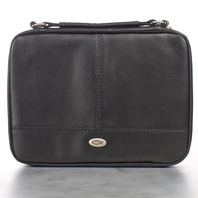 The Two-Fold Bible / Book Case makes a handsome organizer for Bible studies. The added fold provides extra interior storage: card organizer, zipped mesh pocket, slip pocket, 5 pen loops and a notepad slot. (A notepad and pen/marker are included.) There is an exterior zipper with a cross engraved zipper-pull, a convenient, comfortable handle and a metal fish emblem. The Bible organizer is constructed of quality man-made material imported from Italy, with the look and feel of real leather (trade name LuxLeather).