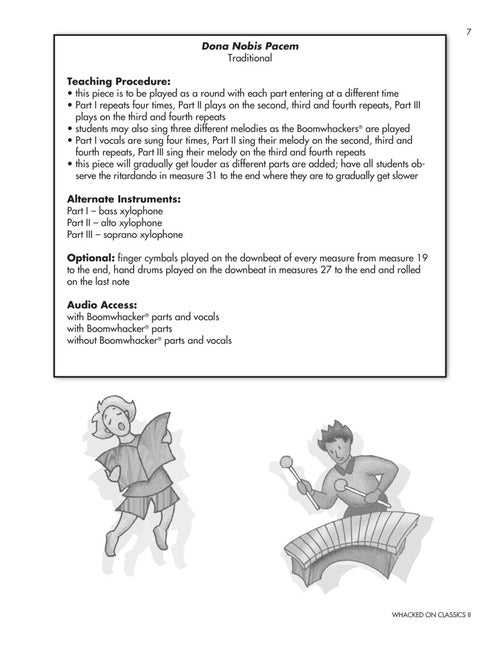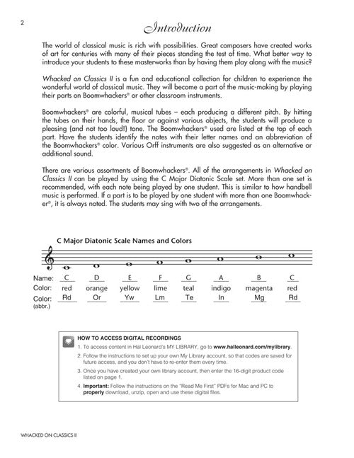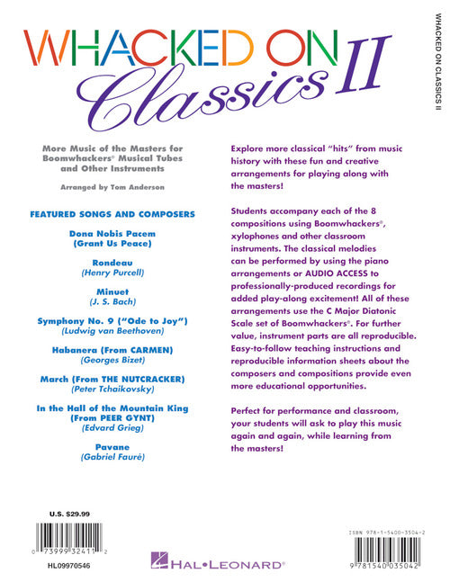 Explore more classical hits from music history with these fun and creative arrangements for playing along with the masters! Students accompany each of the 8 compositions using Boomwhackers®, xylophones and other classroom instruments. The classical melodies can be performed from the piano arrangements or AUDIO ACCESS to professionally-produced recordings for added play-along excitement! All of these arrangements use the C Major Diatonic Scale set of Boomwhackers®. For further value, instrument parts are all reproducible. Easy-to-follow teaching instructions and reproducible information sheets about the composers and compositions provide even more educational opportunities. Featured songs and composers: Dona Nobis Pacem (Grant Us Peace), Rondeau (Purcell), Minuet (JS Bach), Symphony No. 9 Ode to Joy (Beethoven), Habanera from Carmen (Bizet), March from The Nutcracker (Tchaikovsky), In the Hall of the Mountain King from Peer Gynt (Grieg), Pavane (Faure). The price of this book includes a unique code that provides access to audio tracks online, for download or streaming. The tracks include PLAYBACK+, a multi-functional audio player that allows you to slow down audio without changing pitch, set loop points, change keys, and pan left or right - available exclusively from Hal Leonard. Suggested for grades 4-8.